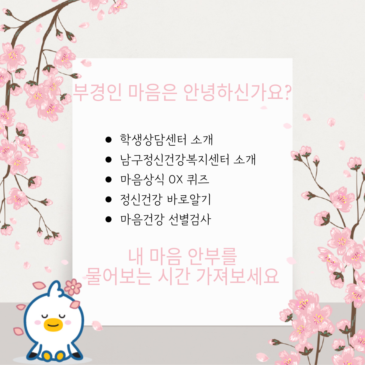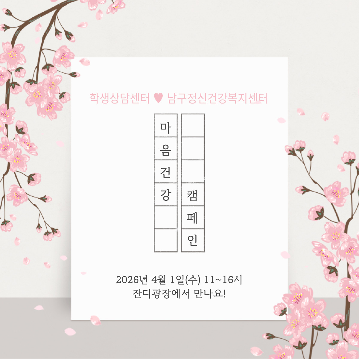 ♥우리동네 마음지킴이 '남구정신건강복지센터'와 '학생상담센터'가 핑크캠퍼스 잔디광장을 찾아갑니다! 우리 부스에 방문하셔서 간단한 마음건강 검사도 해보고 정신건강 정보도 얻고 평소 궁금했던 점도 편하게 물어보세요 ♥작은 관심이 마음건강을 지킵니다. <마음건강 캠페인> 일시: 2026년 4월 1일(수) 11:00~16:00 장소: 잔디광장